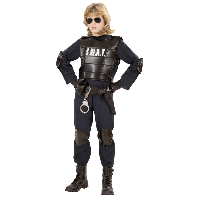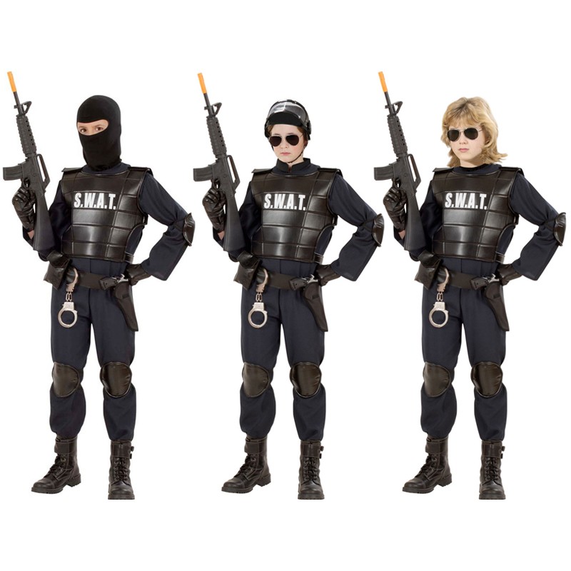 Costume de carnaval pour enfants 5-16 ans, déguisement d'agent S.W.A.T. Le déguisement se compose d'un costume avec gilet para-balles, ceinture avec gaine et porte-monnaie, genouillères, pour enfants et garcons 5-16 ans.