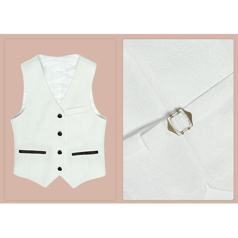 Il completo è costituito da 5 pz: giacca, gilet, pantaloni, camicia e papillon.