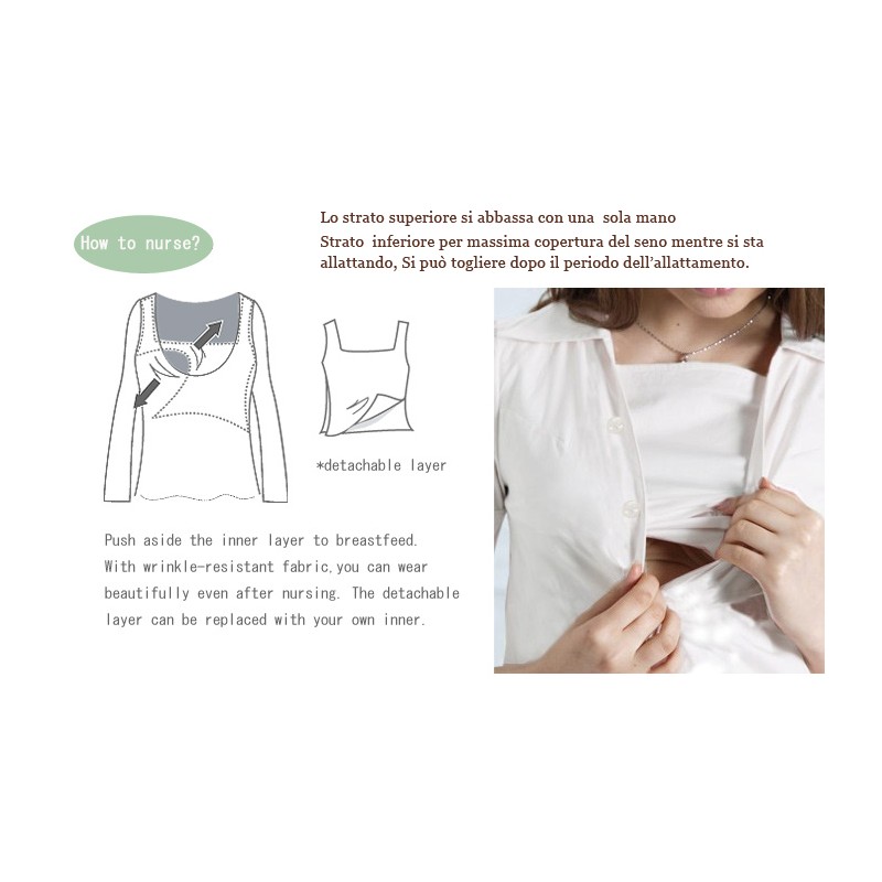 Per l' allattamento, la camicia ha una speciale apertura nascosta; è facile sollevare lo strato esterno per la poppata, mentre lo strato interno vi assicura la massima discrezione anche quando dovete allattare in un luogo pubblico.